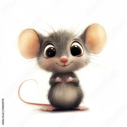 Cute cartoon mouse with big ears and fluffy body, standing on white background, exuding playful and cheerful vibe