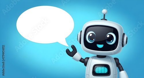 Cute cartoon robot holding blank speech bubble, cheerful smile, big expressive eyes, on blue background