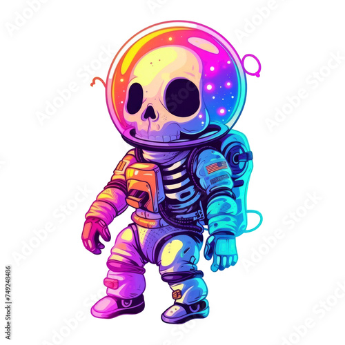Cute cartoon skeleton wearing an astronaut suit in neon cosmic and colorful style, for t-shirt design and printed stickers, isolated background
