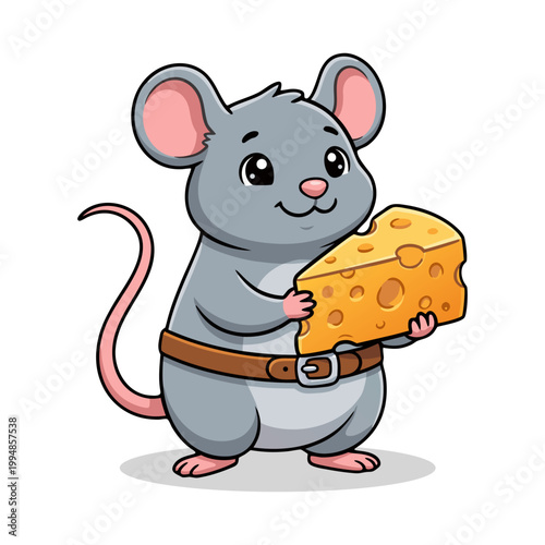Cute Cartoon Style Mouse Holding Piece of Cheese Character Illustration