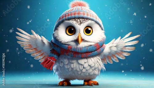 owl, snow, hat, foulard, christmas, holiday, winter, bird, cartoon, animal, dance, dancing, happy, joy, card, snowing, character, funny, wildlife, beak