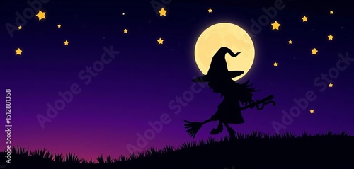 Cute cartoon witch silhouette, stars & moon background, flat design, spell