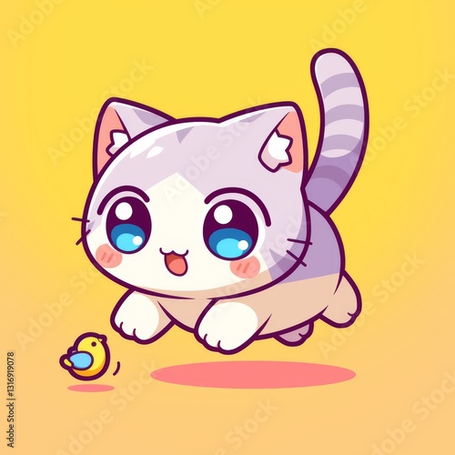 cat, bird, cute, cartoon, animal, illustration, graphic, design, anime, character, digital, art, drawing, pastel, colours, jumping, chasing, flying, adorable, playful, happy, fluffy, pet, cartoonish, style, aesthetic, vector, animation, childish