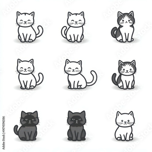 cat, illustration, cute, grid, minimalistic, art, playful, design, animal, breed, expression, black cat, white cat, tabby, cartoon, graphic, creativity, fun, pet, felino, character, simplicity, ornament, colourful, modern, sketch, design, digital artwork, drawing, home decor, unique, collection, stylish, charming, aesthetic, whimsical, joy