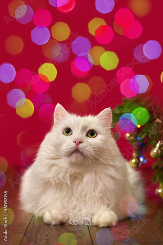 cute cat sits on background of multi-colored bokeh on red background, New Year's Christmas picture