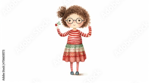 Cute character girl watercolor illustration in Christmas style on white background. Red and green colors.