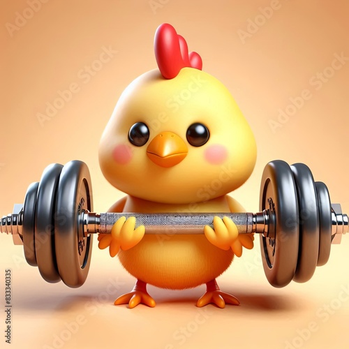cute, chicken, lifting, dumbbell, cartoon, three-dimensional, character, illustration, fun, adorable, animal, playful, digital artwork, fantasy, whimsical, happy, animated, fitness, exercise, creative, colourful, joy, fun-loving, charming, physical exercise, strength, gym, weightlift