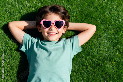 cute child in heart-shaped sunglasses lying on green grass under sunny sky, smiling happily, enjoying a carefree childhood moment outdoors.Generated by AI