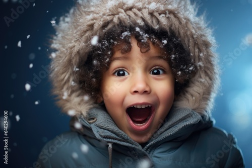 Cute child with happy face wearing a warm hat and warm jacket surrounded with snowflakes. Winter holidays concept.