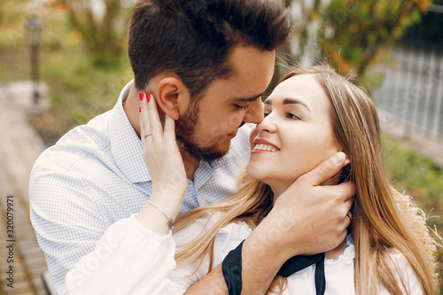 Cute couple in a park. Lady in a white dress. Guy in a white shirt