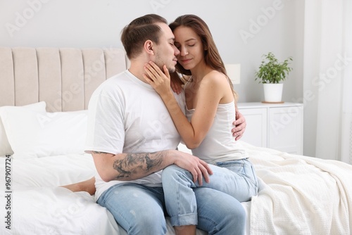 Cute couple spending time together on bed at home