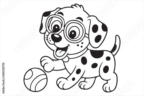 Cute dalmatian puppy with glasses playing with a ball coloring page silhouette white background