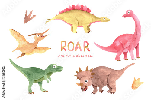 Cute dinosaurs watercolor set. Cute hand drawn illustration of dinosaurs, perfect for childish textiles and printing isolated on white.