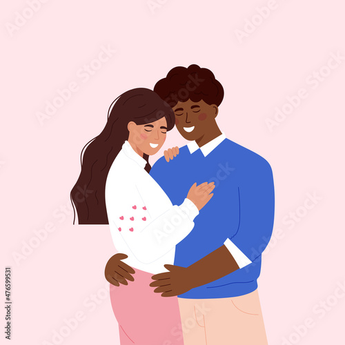 Cute diversity couple hugging. Happy Valentine's Day. Couple in love. Man and woman embracing each other affectionately. Characters for the feast of Saint Valentine. Banner. Isolated