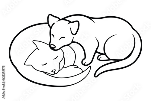 dog, cat, sleeping, cute, animal, pet, friendship, love, comfort, peaceful, rest, together, illustration, drawing, line, art, outline, simple, minimalist, adorable, innocent, warmth, cosy, domestic, animal, companionship, gentle, sweet, napping, dreaming