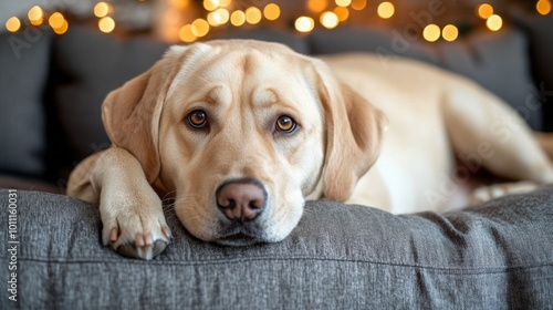 Cute dog. Cute cozy pet Christmas home photo. Xmas calming mood animal. Funny portrait of pets in decorated indoor family cosy atmosphere. Winter season banner design