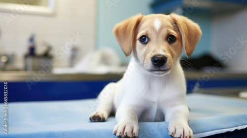 cute dog on the table at a veterinarian's appointment in a veterinary office, animal clinic, puppy, pet, treatment, doctor, canine, disease, medicine, hospital, wool, portrait, eyes, ill, room, funny