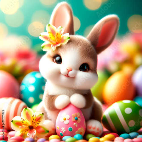 Cute Easter baby bunny smiling charmingly among brightly painted colored eggs and spring alstroemeria flowers. Easter greeting card