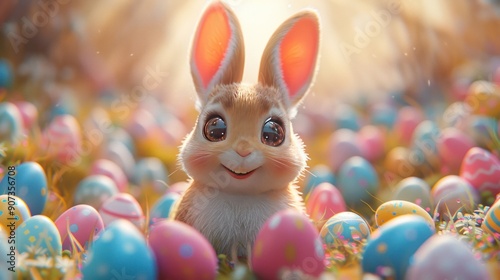 Cute Easter Bunny Surrounded by Colorful Eggs