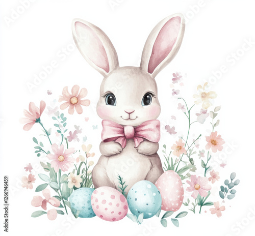 Cute Easter bunny with a bow, surrounded by flowers and Easter eggs, in pastel colors, in a clipart style, isolated on a white background. Watercolor