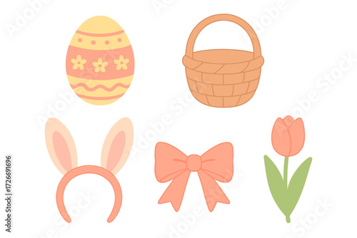 Cute Easter holiday elements collection with decorated egg, bunny ears headband, woven basket, decorative bow, and spring tulip flower