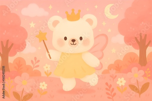 Cute Fairy Bear with Magic Wand in Pink Pastel Fantasy Garden – Adorable Cartoon Animal Character Illustration for Kids
