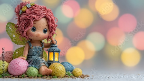 Cute fairy figurine with pink hair holding a lantern, surrounded by colorful eggs, on a blurred bokeh background.