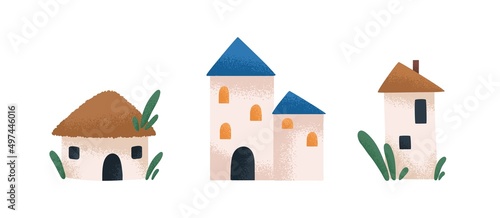 Cute fairytale house, home, castle and tower. Abstract childish buildings set. Tiny fairy tale constructions for childrens fiction. Kids flat vector illustrations isolated on white background