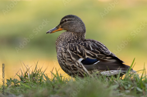 Cute female mallard resting near a pond in a forest.