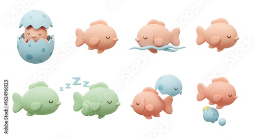 fish, cute, cartoon, illustration, pastel, orange, green, blue, isolated, character, digital, design, set, collection, adorable, baby, egg, sleeping, swimming, peaceful, children, graphic, element, vector, three-dimensional, art, creative, minimalistic, modern, simple