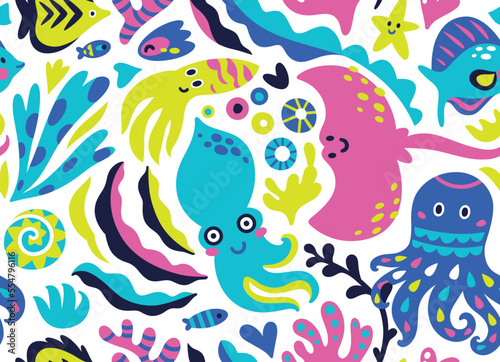 Cute flat sea life creatures in childish style
