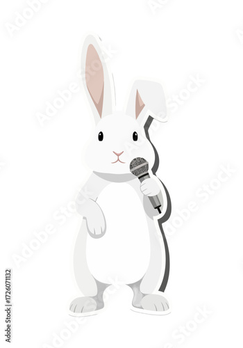 rabbit, microphone, singing, cartoon, vector, illustration, cute, animal, character, pet, performer, entertainer, talking, speaking, mascot, studio, stage, voice, audio, sound, music, flat, minimal, simple, sticker, funny, happy, design element, graphic