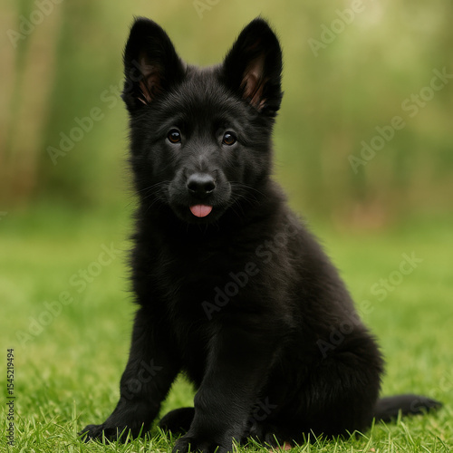 Cute fluffy black German Shepherd puppy sitting on green grass with tongue out in outdoor park setting on a soft-focus natural background