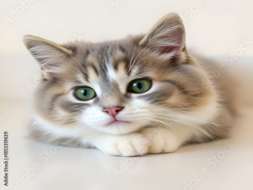Cute fluffy cat with green eyes resting on light background