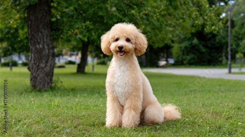Cute fluffy dog sitting on green grass in outdoor park with trees, cheerful expression and playful posture, perfect for pet lovers and animal enthusiasts