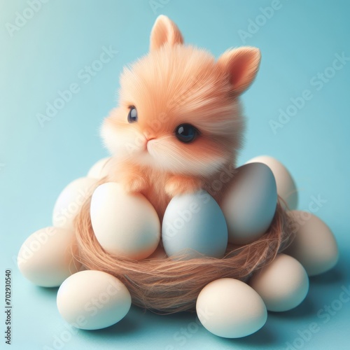Cute fluffy red Easter bunny toy in basket with eggs on a pastel blue background. Minimal Easter holiday concept. Wide screen wallpaper. Web banner with copy space for design.
