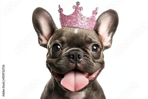 Cute French bulldog pup in a pink glitter crown panting and staring ahead on a white backdrop