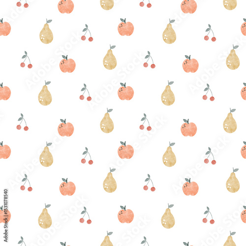 Cute fruit seamless pattern with cherry, pear, and apple. Watercolor texture in pastel colors. Childish digital design.