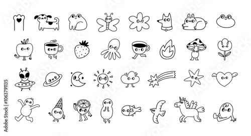 character, groovy, vignetting, linear, funky, tattoo, dog, little, social, flower, hot drink, cup, unicorn, media, cute, icon, vector, set, retro, apple, strawberry, mushroom, line, flames, sun, moon, star, cloud, nubes, alien, spaceship, flower child, planet, octopus, fish, bird, lemon, rabbit, frog, paw, butterfly, shooting, winged, doodle, drawing, collection, whimsical