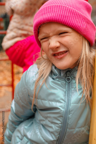 Cute funny blond preschool girl making faces outdoors on a autumn day. Girl wearing pink beanie and blue wind jacket. Vertical shot