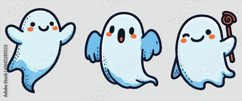 ghost, icon, set, vector, cartoon, halloween, character, white, blue, smiling, surprised, waving, graphic, fun, mascot, fantasy, happy, clip art, decoration, element, symbol, holiday, celebration, party, trick, treat, autumn, season, fall, sticker, badge, artwork, whimsical, playful