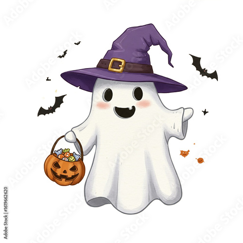 Cute ghost wearing a witch hat holding a pumpkin basket full of candies for Halloween celebrations, a spooky and fun illustration for seasonal design