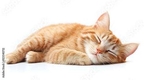 Cute ginger cat sleeping on white background.