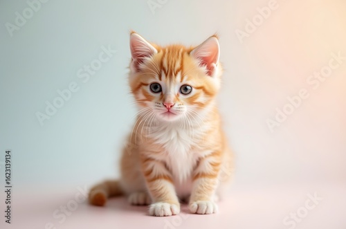 kitten, felino, cat, ginger, orange, red, cute, adorable, small, tiny, baby, young, playful, fluffy, soft, pet, animal, mammal, portrait, face, fur, eye, ear, nose, mouth, whisker, paw, coat, expression, innocent, sweet, charming, lovely, beautiful, domestic, home, companion, light, background, pink, sitting, studio, photo, image, picture, vertebrate