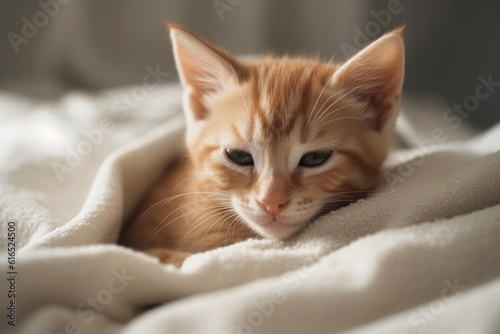 Cute ginger kitten sleeps sweetly at home on sofa wrapped in a blanket, AI generative
