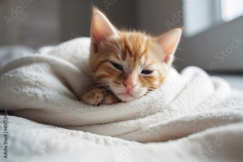 Cute ginger kitten sleeps sweetly at home on sofa wrapped in a blanket, AI generative