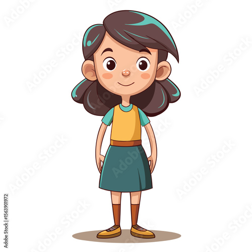 girl, children, cartoon, character, cute, happy, smiling, brown hair, long hair, yellow, teal, skirt, hand, standing, foot, shoe, sock, face, eye, nose, mouth, illustration, design, art, children, friendly, animated, drawing, digital, positive, adorable, smiling face, elementary, back to school, schoolgirl