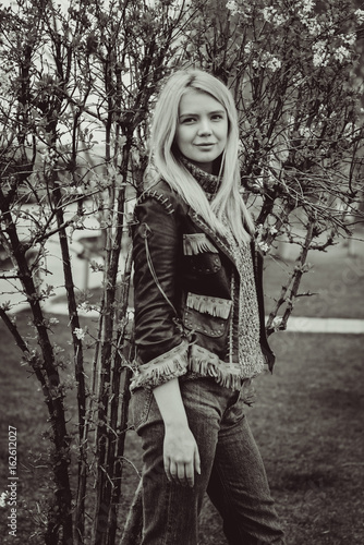 Cute girl from small american town, pretty young woman in leather jacket outdoors