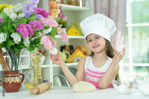 Cute girl in chefs hat making dough