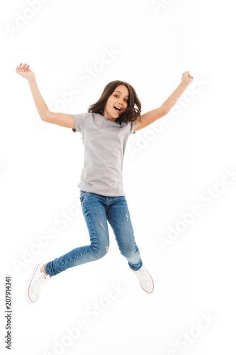 Cute girl jumping isolated over white wall background.